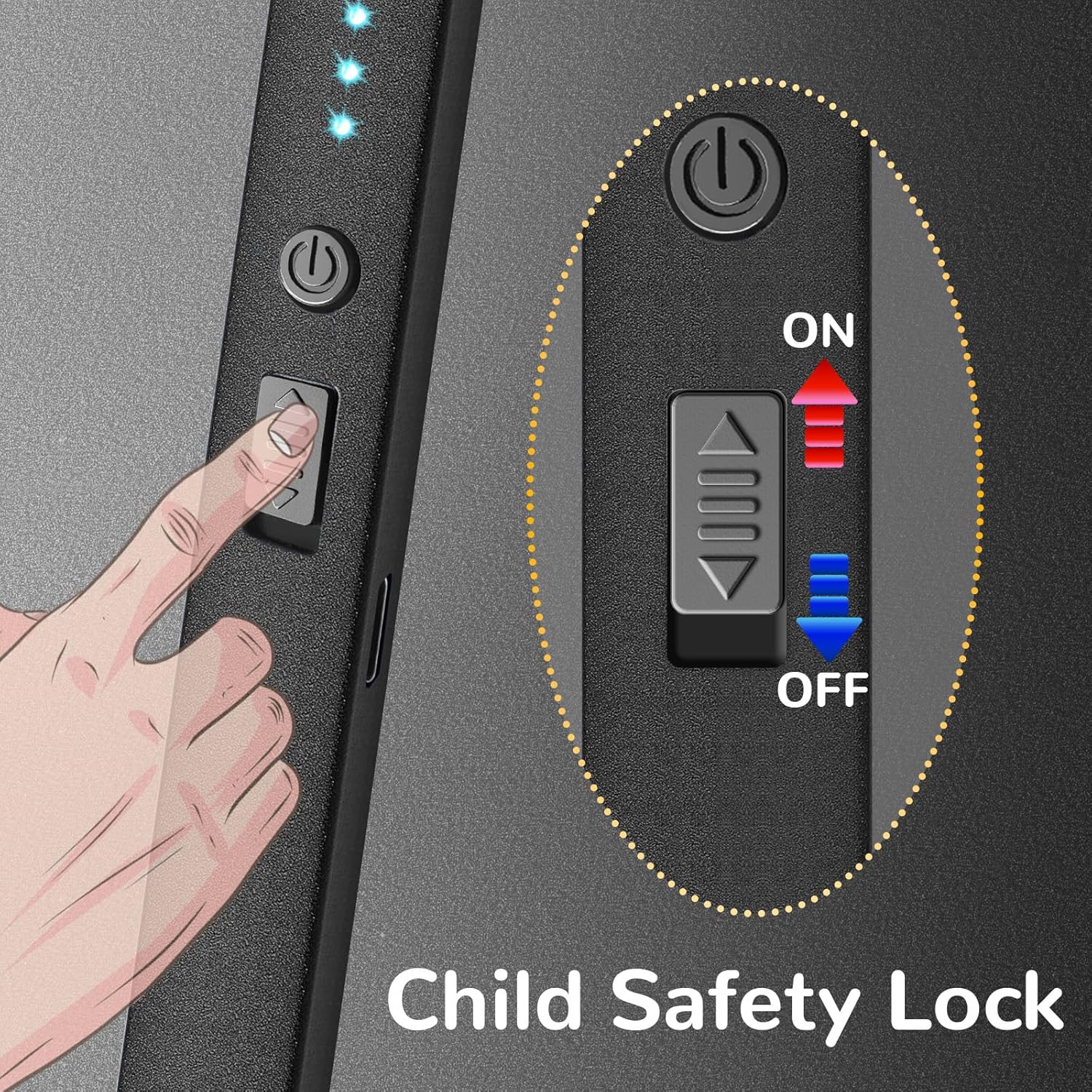 MULTIPLE SAFETY PROTECTION: 1) Designed with child safety in mind, you have to push the safety lock switch first, then press the ignition switch to work. 2) 7s Auto Off: The electric arc will automatically turn off after 7 seconds per use